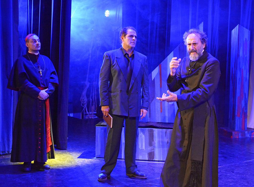 Nel corso dello spettacolo, dunque, mentre gli eventi si susseguono a ritmo incalzante, quasi come nei romanzi di Agatha Christie, i protagonisti – uomini con idee e visione del mondo totalmente differenti – si scontrano e si confrontano. Cos’è giusto, e cosa non lo è? A cosa deve aspirare, in cosa deve credere un individuo, una società, l’umanità? Tutte domande che ci tormentano e a cui, da millenni, noi e i nostri simili cerchiamo invano una risposta. Trovare questa risposta, oggi più che mai, è però impellente. È necessario per evitare il disfacimento e lo sfacelo delle nostre società. E il teatro – espressione fra le più antiche dell’anima umana, nata in caverne rischiarate dal traballante chiarore del fuoco migliaia di anni fa come fusione di sacro, arte e magia – non può sottrarsi al suo compito. Non può non provare a rappresentare il contropotere della verità. Fabrizio Catalano