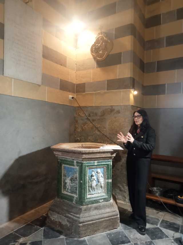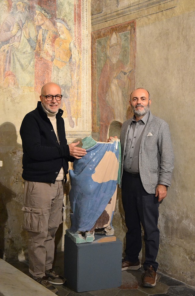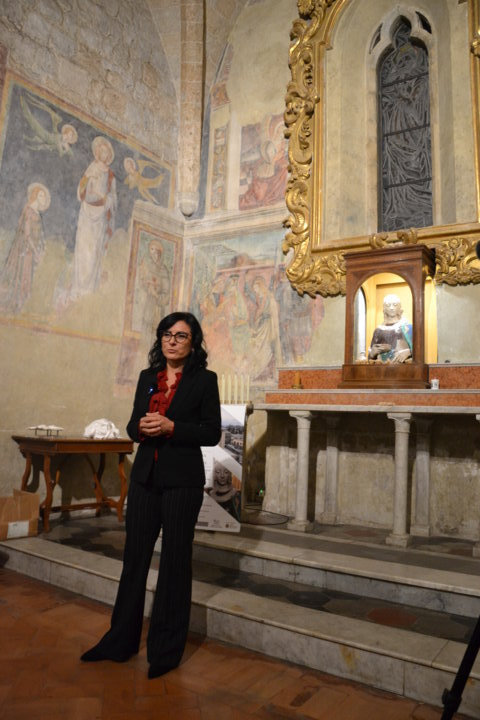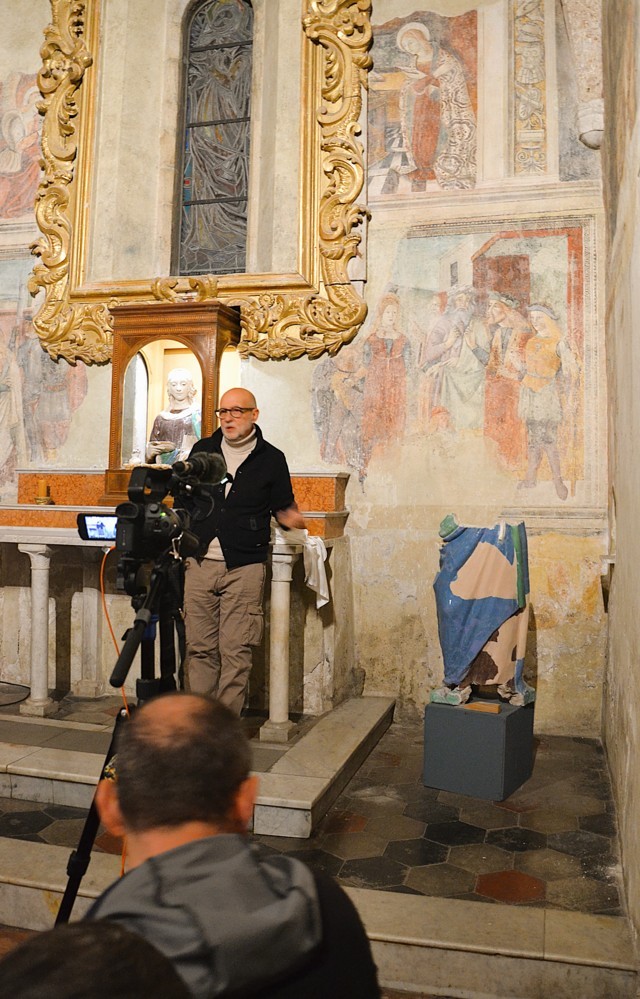 Terminata la prima sessione, l’incontro è proseguito nella Basilica di Santa Cristina, all’interno della cappella di Santa Lucia: Saverio Ricci ha preso la parola per chiarire come, anche in questo caso, pressoché ignote siano le peripezie conservative subìte dalla statua a tuttotondo di Santa Lucia, di cui era noto, almeno dalla metà del XIX secolo, il solo mezzobusto, prima che fossero rinvenuti fortuitamente trent’anni fa dal restauratore Mariano Marziali, e poi identificati solo di recente, i restanti frammenti della figura, che sono stati ricomposti nel laboratorio del restauratore e attendono ora di essere riunificati con il tronco superiore. Al racconto del ritrovamento eccezionale di Marziali e all’illustrazione delle prossime fasi del restauro, con la realizzazione di un supporto metallico che garantisca stabilità all’insieme degli elementi in terracotta, hanno fatto eco le considerazioni di Ricci secondo cui la figura, per il fatto di essere praticamente a grandezza naturale e per la sua tridimensionalità, accentuata dal movimento delle gambe, doveva essere posizionata in modo da poter essere vista e ammirata da tutti i lati. Pertanto, è possibile che fosse sopraelevata su un piedistallo e collocata in un sacello consacrato al culto della santa, senza escludere che provenga in origine da un altro edificio di culto, dato che nulla si sa al momento circa la sua destinazione originaria.