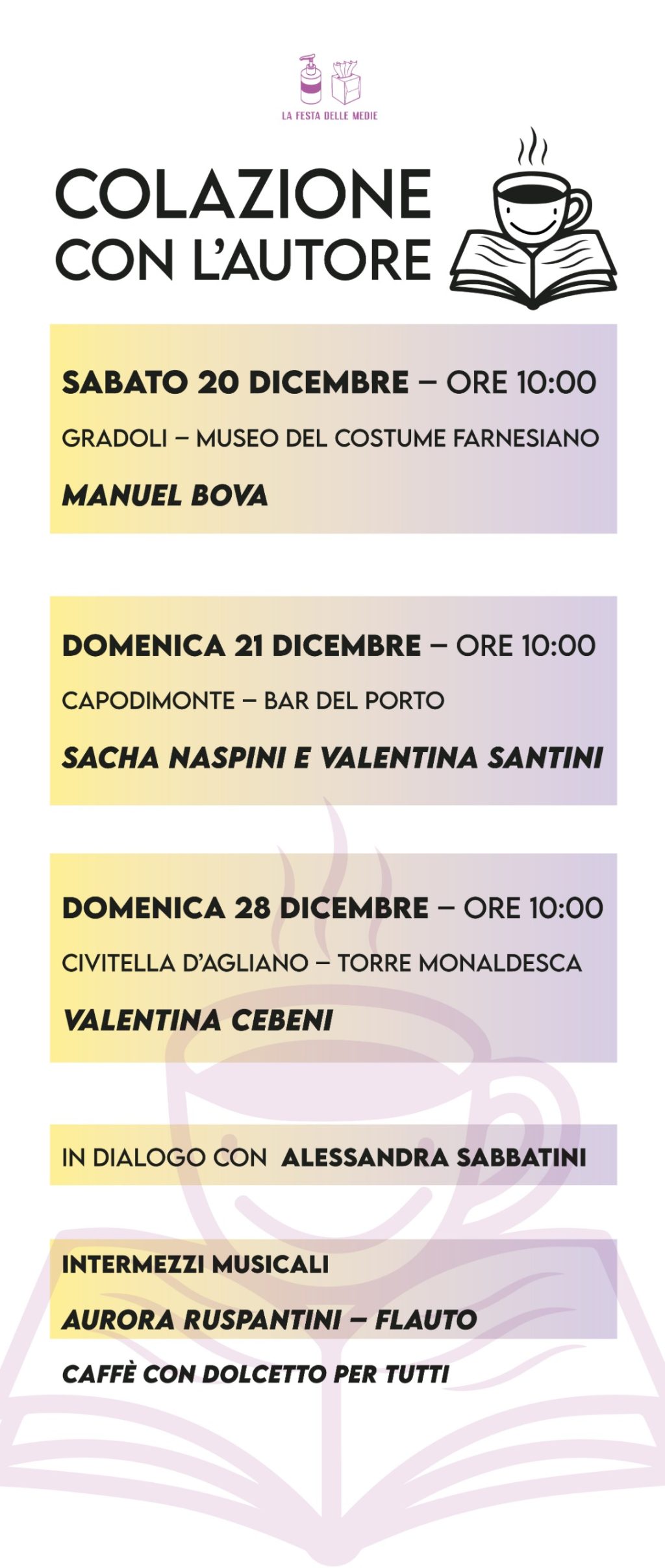Tre mattine dedicate alla letteratura, alla convivialità e al dialogo. Dal 20 al 28 dicembre prende il via “Colazione con l’autore”, il nuovo format culturale promosso dall’associazione La Festa delle Medie: tre appuntamenti mattutini in tre borghi del territorio – Gradoli, Capodimonte e Civitella d’Agliano – per incontrare scrittori, condividere storie e gustare un caffè insieme.