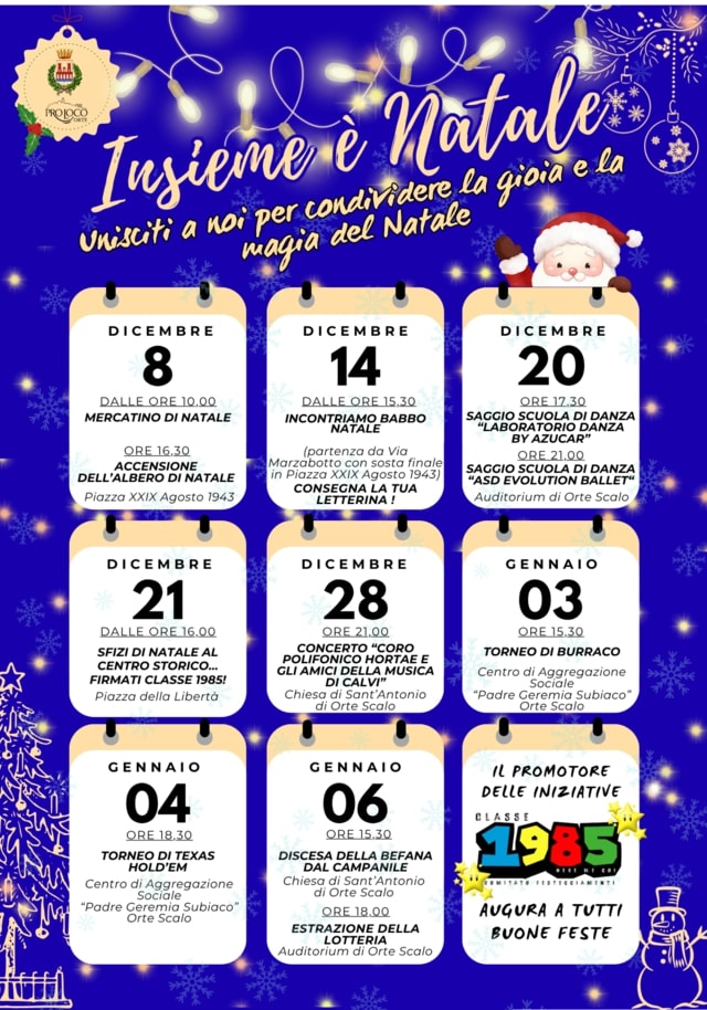 Il Comitato Festeggiamenti Classe 1985 è pronto a far vivere a Orte Scalo tutta la magia del Natale con un ricco programma di eventi che accompagnerà la comunità dall’8 dicembre al 6 gennaio.