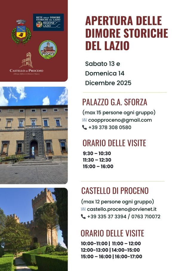 Il Comune di Proceno e la Cooperativa di Comunità Proceno comunicano che, in occasione dell’iniziativa regionale Dimore Storiche del Lazio, nelle giornate di sabato 13 e domenica 14 dicembre 2025 sarà possibile visitare due importanti luoghi della storia locale: