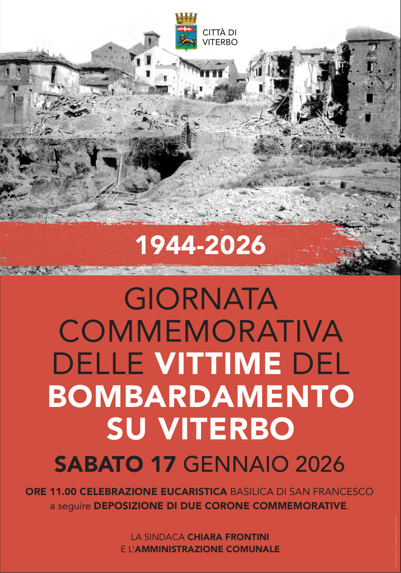 Alle 11 è prevista la celebrazione religiosa alla basilica di San Francesco. Seguirà la deposizione di due corone commemorative, una alla lapide collocata fuori la chiesa e l’altra a piazzale Gramsci, al monumento a ridosso dell’ingresso dell’area Garbini. “Il 17 gennaio, da 82 anni, è una data impressa nella memoria dei viterbesi – sottolinea la sindaca Chiara Frontini -, soprattutto in quella di chi ha vissuto sulla propria pelle una simile tragedia o di chi ha perso un familiare sotto le macerie di quelle bombe. Una triste pagina di storia della nostra città che abbiamo tutti il dovere morale e istituzionale di ricordare”.