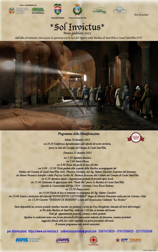 Il palcoscenico scelto per la prossima tappa domenica 21 dicembre 2025 alle ore 15,30 è quello della Basilica di Sant’Elia nel Comune di Sant’Elia (VT) dove i giochi di luce prendono vita annualmente durante l’evento “Sol Invictus“. La manifestazione celebra il Solstizio d’Inverno e lo straordinario fenomeno dei giochi di luce naturale che si manifestano all’interno della suggestiva Basilica di Sant’Elia.