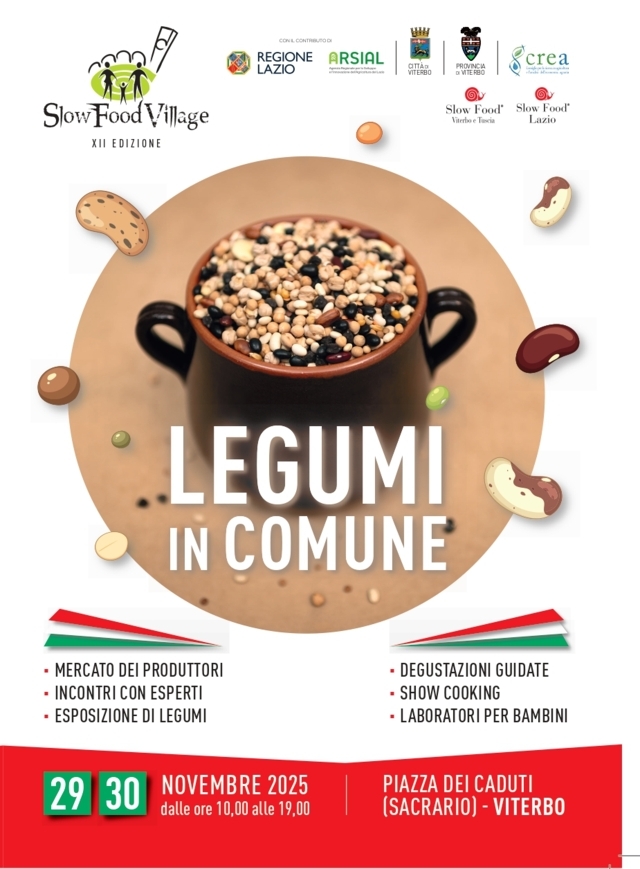 Iniziato il conto alla rovescia per l’inizio dello Slow Food Village, giunto alla 12a edizione, quest’anno interamente dedicato ai legumi. Si parte sabato 29 novembre alle ore 10,30 nella sala consiliare del Palazzo dei Priori del Comune di Viterbo con l’incontro “Legumi in Comune: celebriamo il patrimonio di biodiversità della nostra terra”.