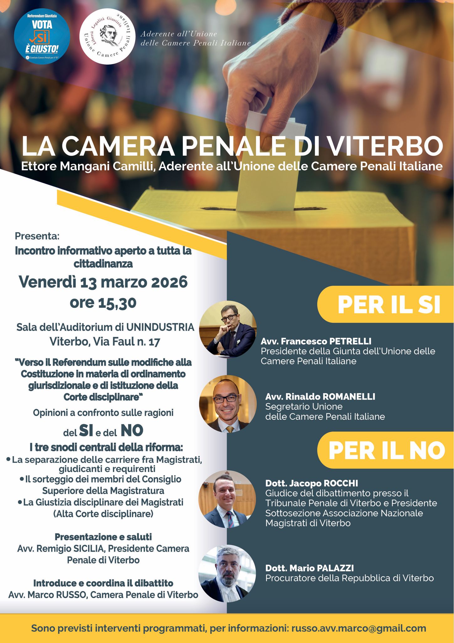 La Camera Penale di Viterbo “Ettore Mangani Camilli”, aderente all’Unione delle Camere Penali Italiane, promuove un incontro informativo aperto alla cittadinanza in vista del prossimo referendum sulle modifiche costituzionali riguardanti l’ordinamento giurisdizionale e l’istituzione della Corte disciplinare.