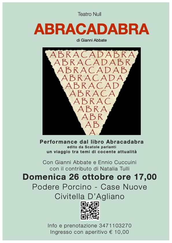 Domenica 26 ottobre alle ore 17,00, presso la sede del Teatro Null Podere Porcino Case Nuove Civitella D’Agliano, la performance “Abracadabra” di Gianni Abbate apre la rassegna “Restiamo umani”.
