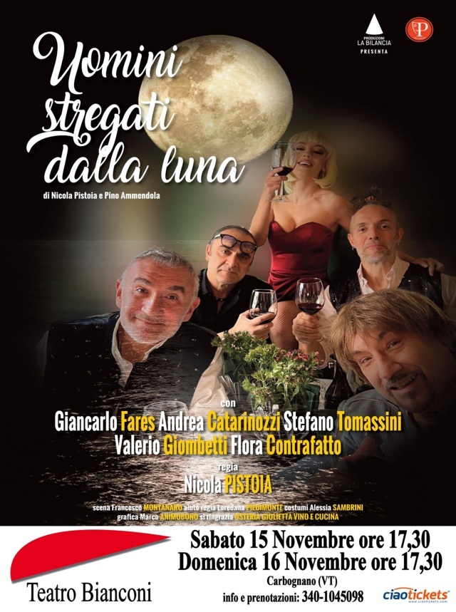 Dopo lo straordinario successo dei primi due spettacoli fuori abbonamento con 4 sold out consecutivi, il prossimo fine settimana, il Teatro Bianconi di Carbognano apre la Stagione in abbonamento ospitando la brillante commedia Uomini stregati dalla luna, scritta da Nicola Pistoia e Pino Ammendola, in un’appuntamento che promette risate e riflessioni. Lo spettacolo andrà in scena sabato 15 novembre 2025 e domenica 16 novembre 2025, con inizio in entrambi i casi alle ore 17.30.