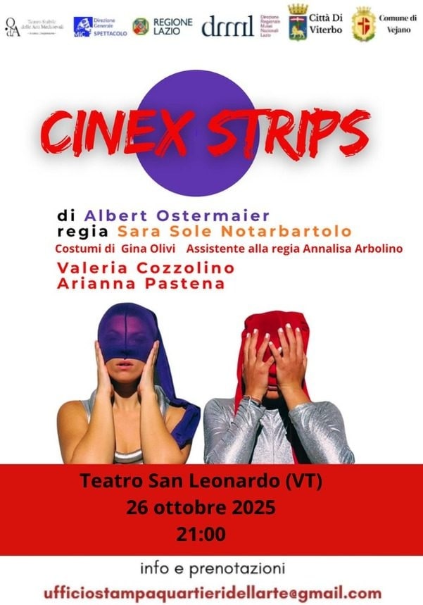 Sara Sole Notarbartolo – pluripremiata regista e drammaturga partenopea attiva nel panorama internazionale – arriva a Viterbo con la regia di “Cinex Strips” di Albert Ostermaier- uno dei maggiori autori tedeschi contemporanei, drammaturgo in residenza del Teatro di Mannheim e il Bayerisches Staatsschauspiel di Monaco, vincitore, tra i vari, del “Premio Kleist” – nell’appuntamento di domenica 26 ottobre alle ore 21,00. Così prosegue l’edizione 2025 del Festival Quartieri dell’Arte, che nella sua prestigiosa storia vanta collaborazioni e rapporti con grandi realtà e personalità del mondo di lingua tedesca, come il Burgtheater di Vienna, il Residenz Theater di Monaco di Baviera, la Volksbuehne di Berlino, Marius von Mayenburg, Fritz Kater, Roland Schimmelpfennig e che in questo caso ha procurato l’incontro tra la scrittura di Ostermaier in forte dialogo con i suoi antecedenti tedeschi e la sensibilità ironica, magica e tagliente di Sara Sole Notarbartolo. Alla regista è riconosciuta anche l’incredibile capacità di scelta e direzione degli attori; in questo caso si tratta di Valeria Cozzolino e Arianna Pastena, giovani e talentuose attrici napoletane, che hanno assunto nei propri corpi le storie di Ostermaier – racconta la regista – e, respirandoli, ne hanno ridefinito le possibilità e il senso.