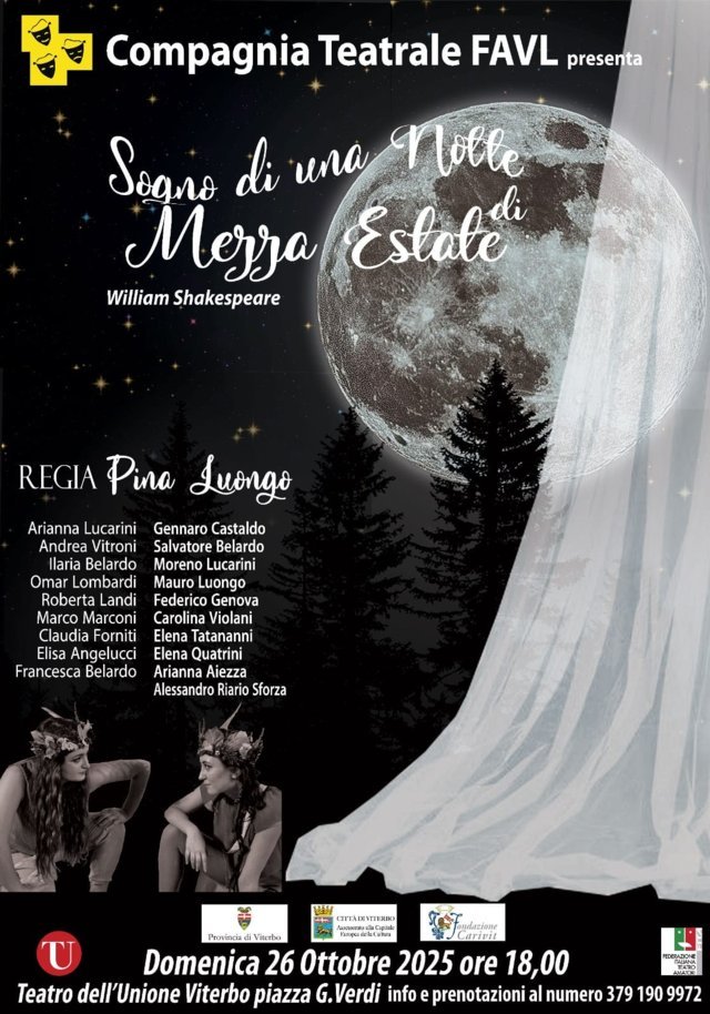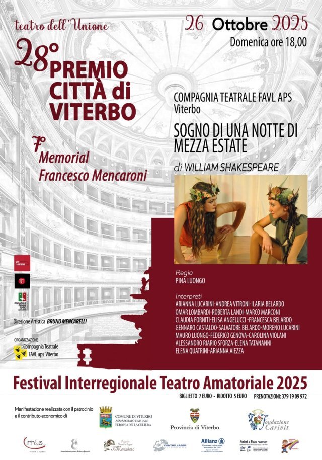 Al Teatro dell’Unione domenica 26 ottobre alle 18 l’ultimo appuntamento dell’edizione 2025 del Festival interregionale di teatro amatoriale città di Viterbo – 28° premio Città di Viterbo e 7° Memorial Francesco Mencaroni. L’Unione di Viterbo ospiterà la serata di premiazioni, preceduta dalla commedia Sogno di una notte di mezza estate, portata in scena, fuori concorso, dalla Compagnia FAVL.