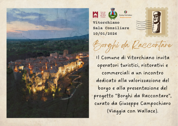 L’incontro, a ingresso libero, rappresenta un momento di confronto e condivisione con amministrazione comunale, operatori economici e associazioni, pensato per costruire una rete locale, esplorare opportunità di collaborazione e avviare un percorso condiviso di promozione di Vitorchiano all’interno del format “Borghi da Raccontare“.