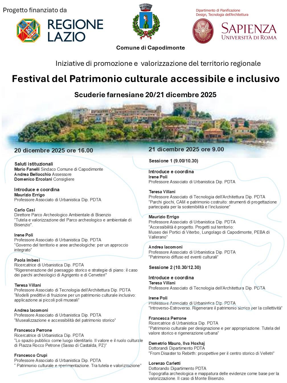 L’iniziativa, promossa dal Comune di Capodimonte con il finanziamento della Regione Lazio e in collaborazione con il Dipartimento di Pianificazione, Design e Tecnologia dell’Architettura (PDTA) della Sapienza Università di Roma, rappresenta un’occasione concreta per riflettere sulle potenzialità di rigenerazione del territorio nel segno dell’inclusione e dell’accessibilità. Tra i relatori anche Carlo Casi, direttore del Parco Archeologico e Ambientale di Bisenzio, che porterà l’attenzione su “tutela e valorizzazione del Parco archeologico e ambientale di Bisenzio”, sottolineando l’importanza di un approccio integrato alla valorizzazione del patrimonio.