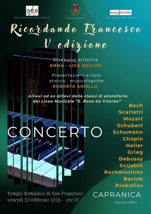 Francesco Andreotti (4 luglio 1986-17 febbraio 2002) viene ricordato a Capranica, presso il Tempio Romanico di San Francesco, grazie ai giovani musicisti, allievi di Anna Lisa Bellini, Matteo Biscetti e Maria Cristina Paolucci, attraverso il suo strumento il pianoforte.