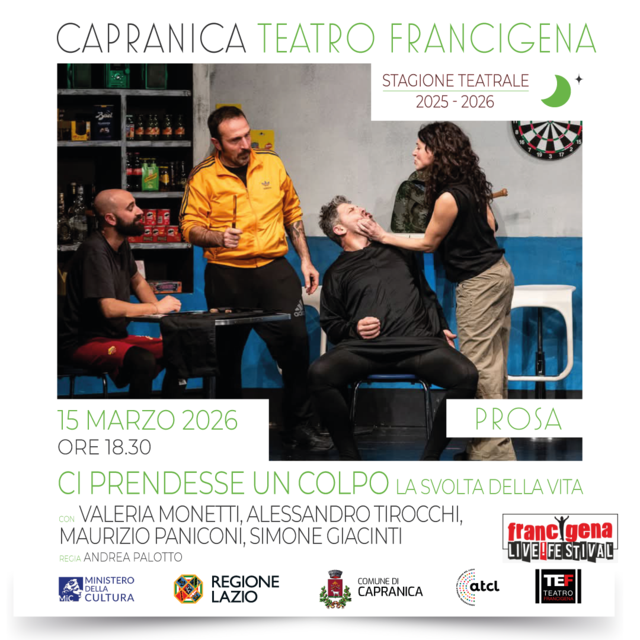Domenica 15 marzo alle ore 18:30 in scena “Ci prendesse un colpo: la svolta della vita” al Teatro Francigena di Capranica.