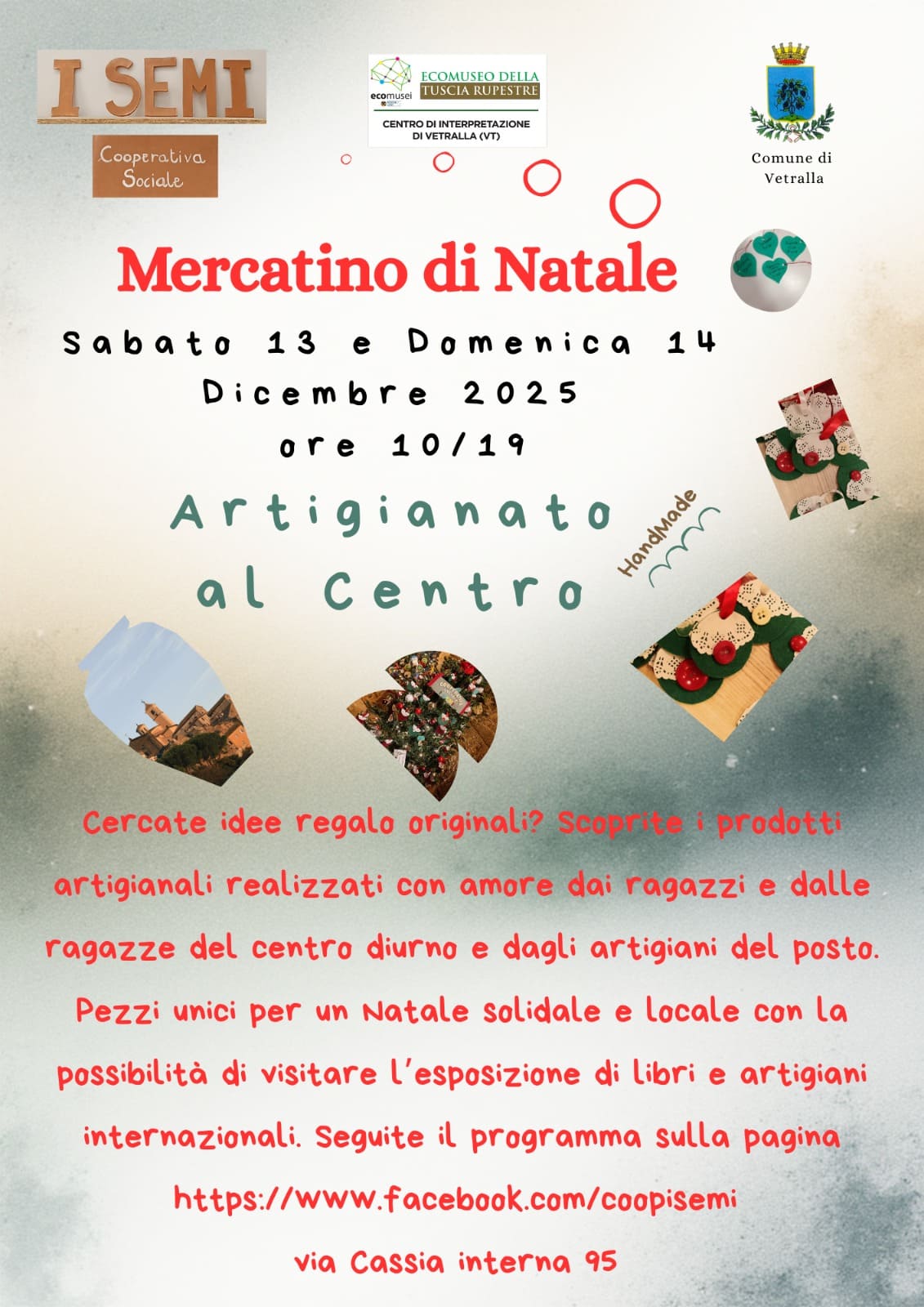 La seconda edizione di Artigianato al Centro avrà luogo sabato 13 e domenica 14 dicembre, dalle ore 10:00 alle 19:00, presso la sede della cooperativa sociale i SEMI in Via Cassia interna 95/97, Vetralla, insieme al tradizionale Mercatino di Natale.