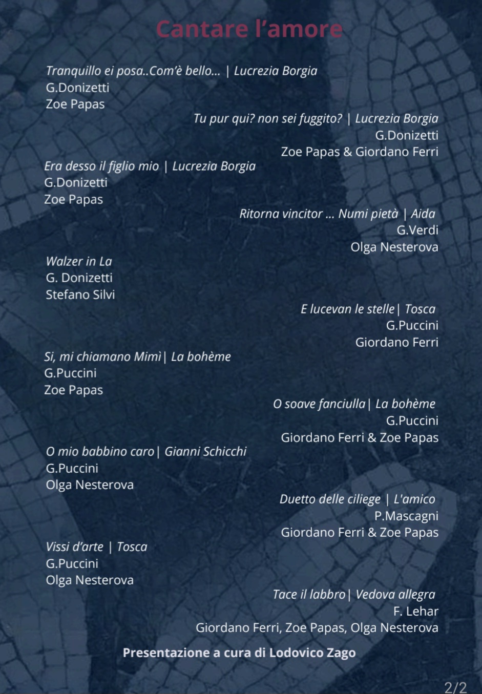 Protagonisti della serata saranno i soprani Zoe Papas e Olga Nesterova, il tenore Giordano Ferri e Stefano Silvi al pianoforte, impegnati in un percorso musicale che mette al centro il sentimento amoroso nelle sue forme più intime e contrastanti. Il programma valorizza la centralità della voce, elemento fondante della tradizione operistica, e il dialogo con il pianoforte come spazio espressivo in cui la parola cantata diventa racconto emotivo. Un’occasione per avvicinarsi al repertorio lirico tra Otto e Novecento in una dimensione raccolta, dove intensità interpretativa ed espressività vocale costituiscono il fulcro dell’esperienza d’ascolto.