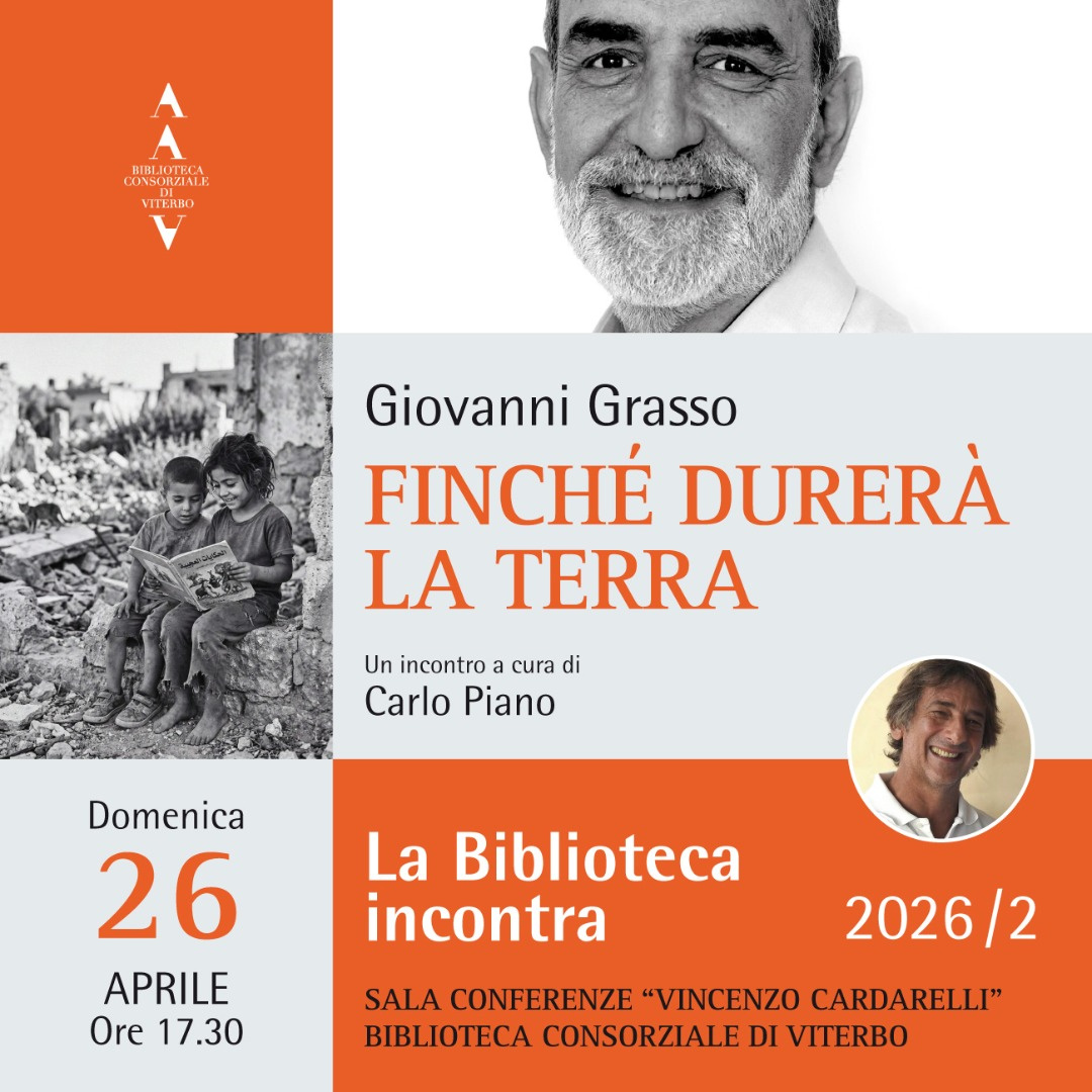 Domani, domenica 26 aprile, alle 17.30, per il nuovo appuntamento della rassegna “La Biblioteca incontra” – stagione 2/2026, sarà a Viterbo Giovanni Grasso per presentare il libro Finché durerà la terra (Rizzoli) in dialogo con Carlo Piano.