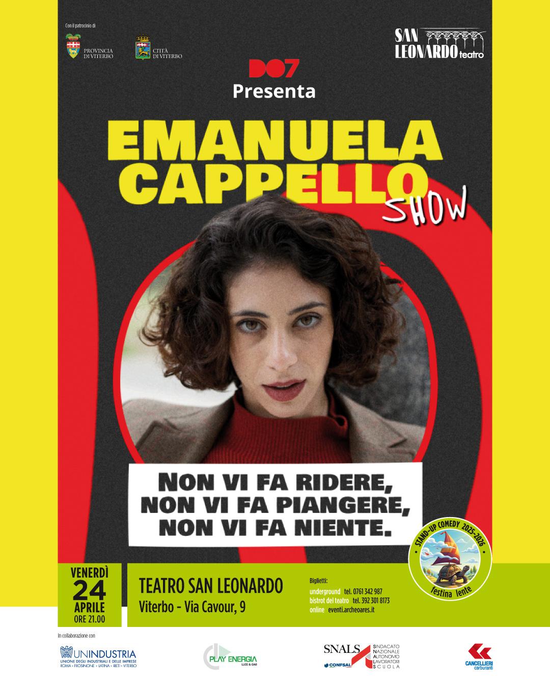 Dai reel virali su Instagram e TikTok al palco, Emanuela Cappello porta gag, monologhi surreali e racconti che attraversano amori fuggenti, corse sulla metro C e cacio e pepe, consolidando un rapporto diretto e immediato con il pubblico. Dopo i sold out di Roma, Milano, Bari e Firenze, la sua comicità continua a registrare un forte riscontro.