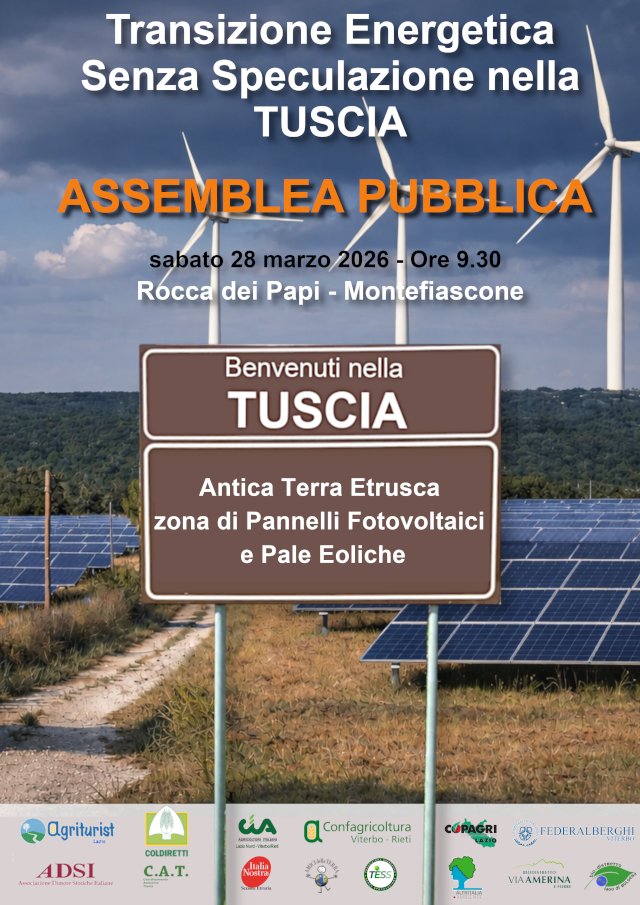 Sabato 28 marzo alle 9.30, alla Rocca dei Papi di Montefiascone, si terrà un’Assemblea Pubblica per illustrare, agli esponenti della Regione Lazio e ai politici che rappresentano il territorio, invitati a partecipare, una serie di proposte in vista dell’approvazione della legge regionale sulle aree idonee e non idonee per gli impianti di energia rinnovabile che deve essere emanata dalla Regione entro il maggio 2026;