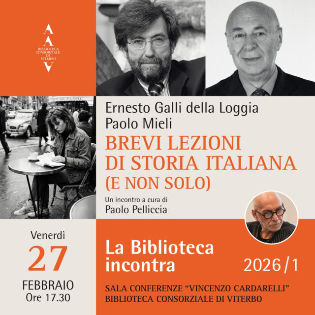 Domani, venerdì 27 febbraio, alle 17.30, per il nuovo appuntamento della rassegna “La Biblioteca incontra” – stagione 1/2026, Ernesto Galli della Loggia e Paolo Mieli presenteranno il libro Brevi lezioni di storia italiana (e non solo) (Solferino), in dialogo con Paolo Pelliccia.