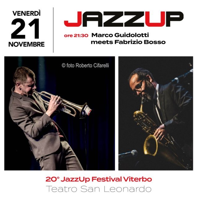 Gran finale per la ventesima edizione di JazzUp Festival Viterbo: venerdì 21 novembre alle ore 21:30 il Teatro San Leonardo ospiterà un evento musicale d’eccezione con Marco Guidolotti meets Fabrizio Bosso, due giganti del jazz italiano insieme in una serata che si preannuncia imperdibile.
