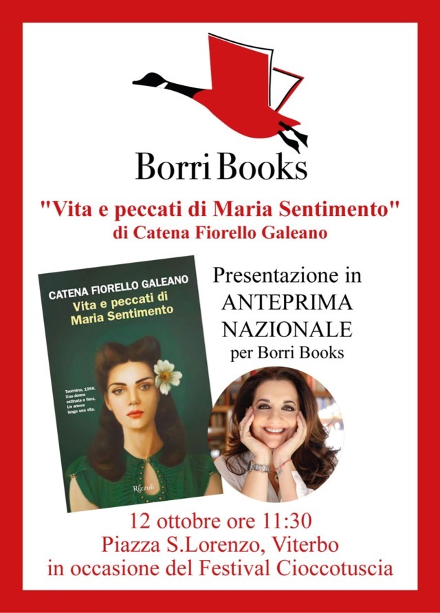 – L’ anteprima nazionale, il 12 ottobre, della presentazione del nuovo romanzo di Catena Fiorello Galeano, in collaborazione con Borri Books