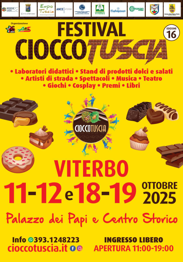 Oggi 7 ottobre, presso la Sala del Consiglio del Comune e alla presenza dei rappresentanti istituzionali e dei partner organizzativi, Il Direttore Andrea Sorrenti ha presentato la 16^ edizione del “Festival CioccoTuscia Viterbo” che si svolgerà nei giorni 11-12 e 18-19 ottobre 2025 presso lo storico Palazzo dei Papi, Piazza S.Lorenzo e altre location del centro storico di Viterbo, con il sostegno delle principali realtà istituzionali del territorio a testimonianza della grande rilevanza raggiunta dalla manifestazione.