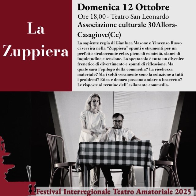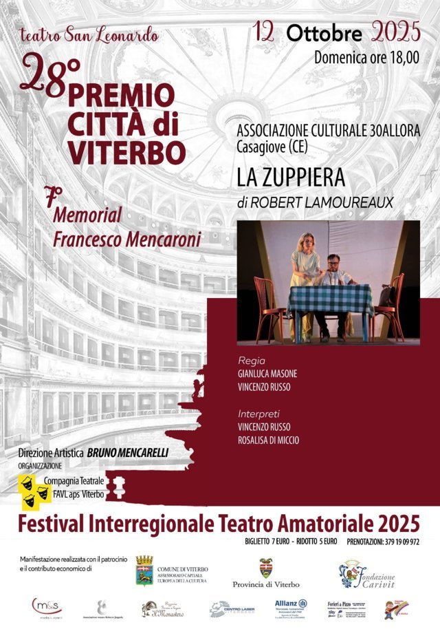 Proseguono gli appuntamenti del Festival interregionale di teatro amatoriale città di Viterbo – 28° premio Città di Viterbo e 7° Memorial Francesco Mencaroni. Domenica 12 ottobre alle ore 18,00 al teatro San Leonardo sarà la volta dello spettacolo La Zuppiera, di Robert Lamoureaux, portato in scena dall’associazione culturale 30Allora di Casagiove (Ce). Tutto un divenire frenetico, tra divertimento e spunti di riflessione. Un mix di comicità, slanci di inquietudine e tensione.