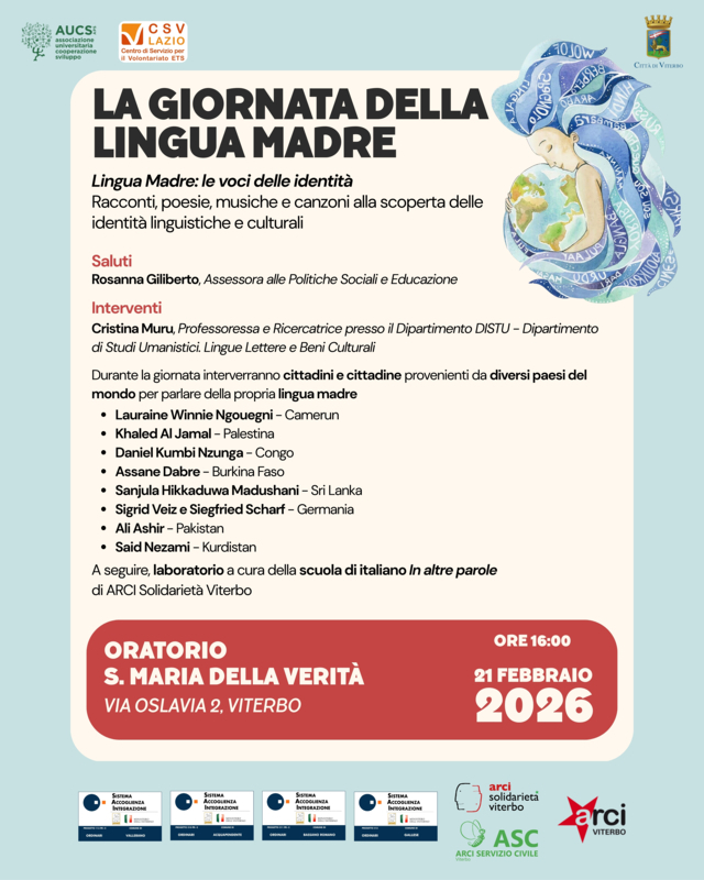 Sabato 21 febbraio alle ore 16 l’Associazione Universitaria per la Cooperazione e lo Sviluppo in collaborazione con il CSV Lazio e con il patrocinio del Comune di Viterbo, presentano presso l’Oratorio di Santa Maria della Verità, la Giornata della Lingua Madre 2026.