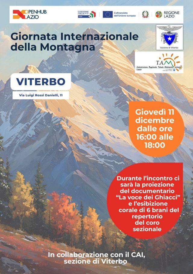 OpenHub Lazio, in collaborazione con la Sezione di Viterbo del Club Alpino Italiano, in occasione della Giornata Internazionale della Montagna, organizza, giovedì 11 Dicembre alle ore 16:00 presso la sala conferenze di OpenHub Lazio – sede di Viterbo, un evento aperto alla cittadinanza.