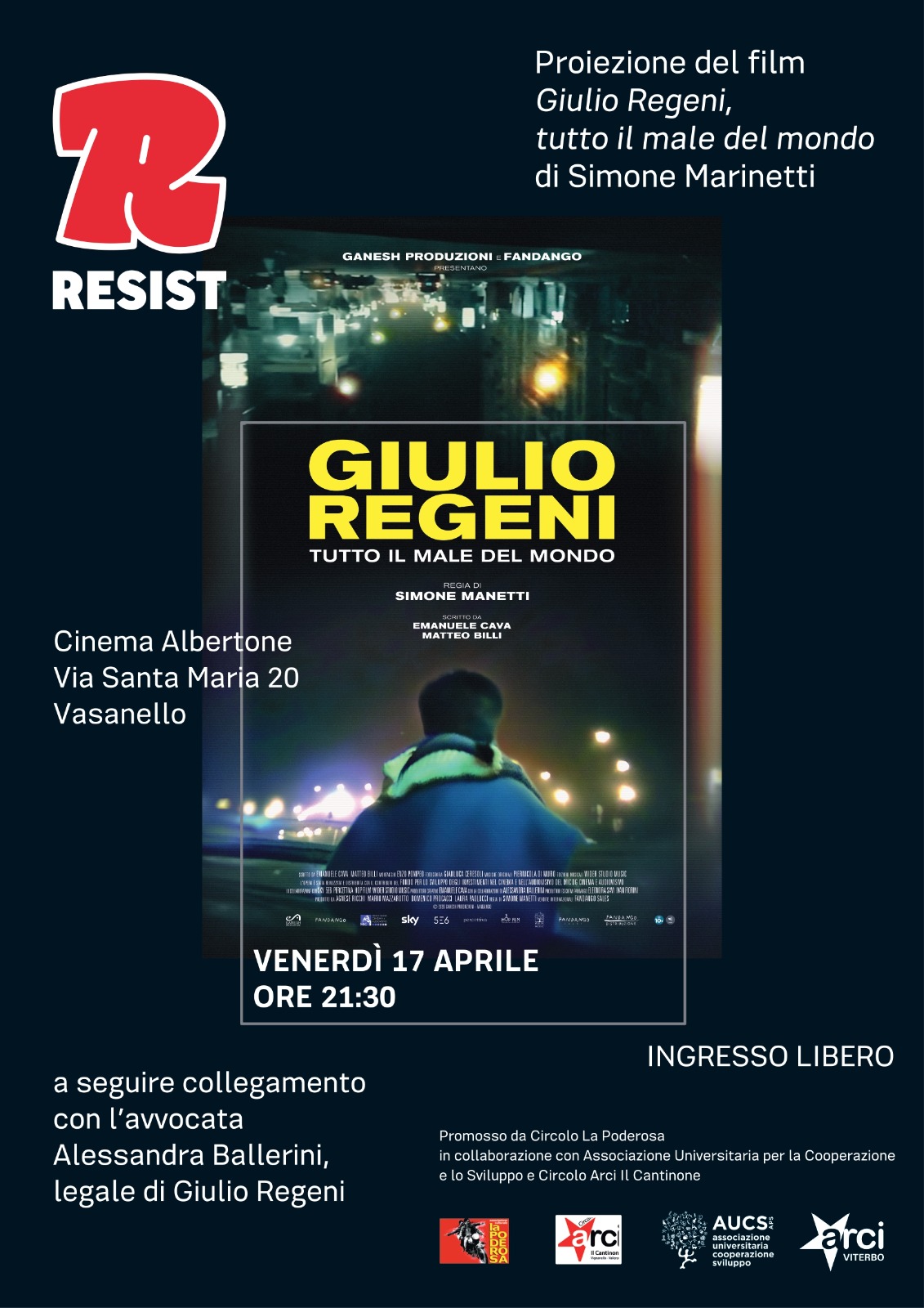La proiezione è a cura di Arci Viterbo e dei circoli AUCS Associazione Universitaria per la Cooperazione e lo Sviluppo, Arci La Poderosa di Vasanello e Il Cantinone di Vignanello.