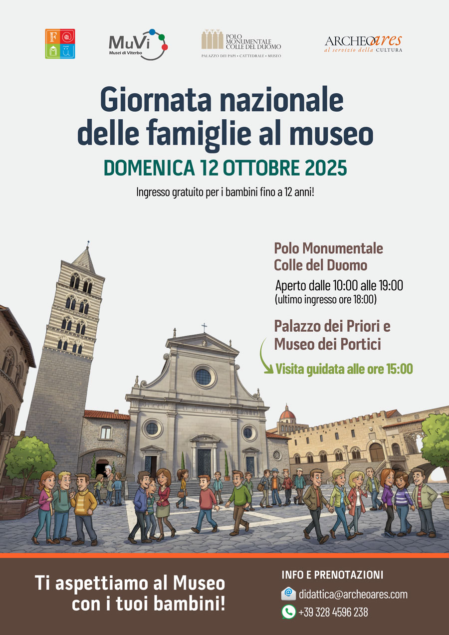A Viterbo Archeoares propone ingresso gratuito per i bambini fino a 12 anni al Polo Monumentale Colle del Duomo – che comprende la visita al Duomo di Viterbo e al Palazzo dei Papi, sede del primo e più lungo conclave della storia – e una visita guidata gratuita alle ore 15:00 al Museo dei Portici e alle sale del Palazzo dei Priori.