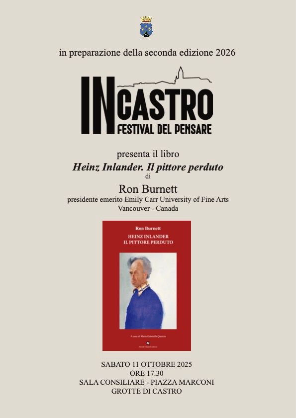 È in programma sabato 11 ottobre, alle 17.30 nella sala consiliare di piazza Marconi, la presentazione del libro “Heinz Inlander. Il pittore perduto” di Ron Burnett, pubblicato da Davide Ghaleb Editore. Si tratta di un evento che rientra nel programma del Festival del Pensare “InCastro”, che in estate vivrà la sua seconda edizione dopo il successo della prima.