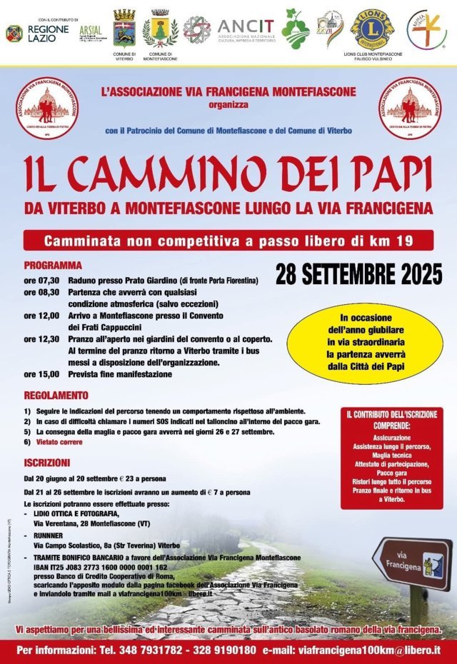 Domenica 28 settembre si rinnova l’appuntamento con il Cammino dei Papi da Viterbo a Montefiascone. La camminata non competitiva avrà inizio alle ore 8:15 con partenza da Pratogiardino.
