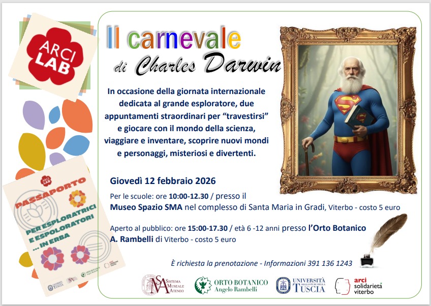 Mascheriamoci e giochiamo con il mondo della scienza. Arci Solidarietà Viterbo vi dà appuntamento giovedì 12 febbraio con «Il carnevale di Charles Darwin» per il Darwin Day, una giornata dedicata al celebre ricercatore e esploratore, che si rinnova in tutto il mondo e che da anni Arci Solidarietà Viterbo organizza a Viterbo in collaborazione con il Sistema Museale di Ateneo (SMA) e l’Orto Botanico A. Rambelli dell’Università degli Studi della Tuscia.