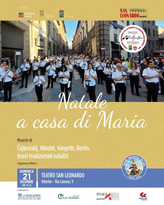 La giornata prosegue alle 18.30 con il concerto “Natale a casa di Maria”, presentato dalla Banda di Viterbo. Un viaggio musicale che intreccia grandi compositori come Čajkovskij, Händel, Vangelis e Irving Berlin ai brani più amati della tradizione natalizia, in un abbraccio sonoro capace di parlare a tutte le generazioni.