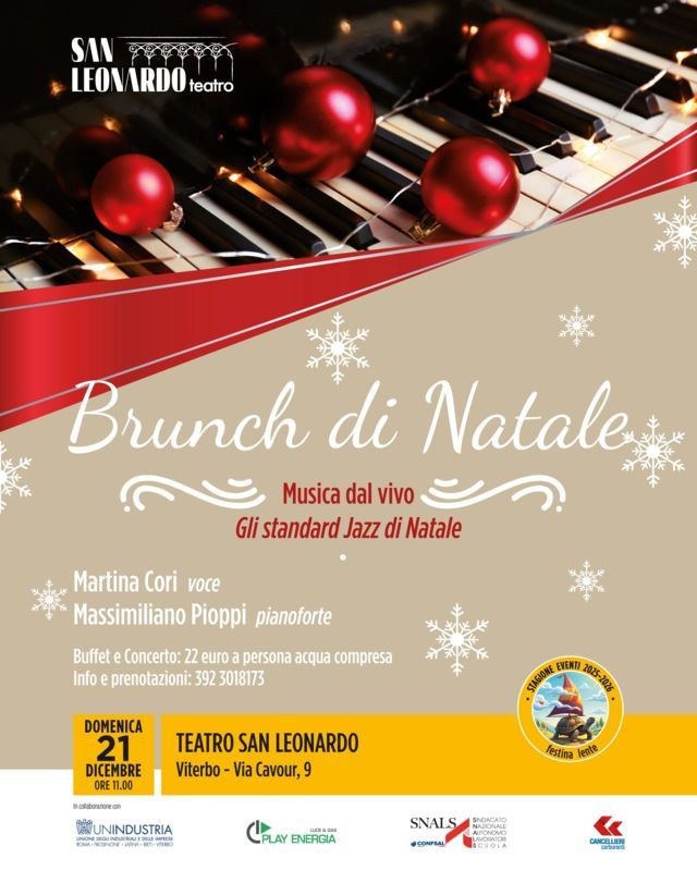 Si parte alle ore 11.00 con il Brunch di Natale, un appuntamento informale e curato, pensato per chi ama il calore delle feste senza rinunciare alla qualità. Buffet e drink accompagnano la musica live di Martina Cori alla voce e Massimiliano Pioppi al pianoforte: un dialogo jazz elegante e accogliente, perfetto per un Natale che profuma di casa.
