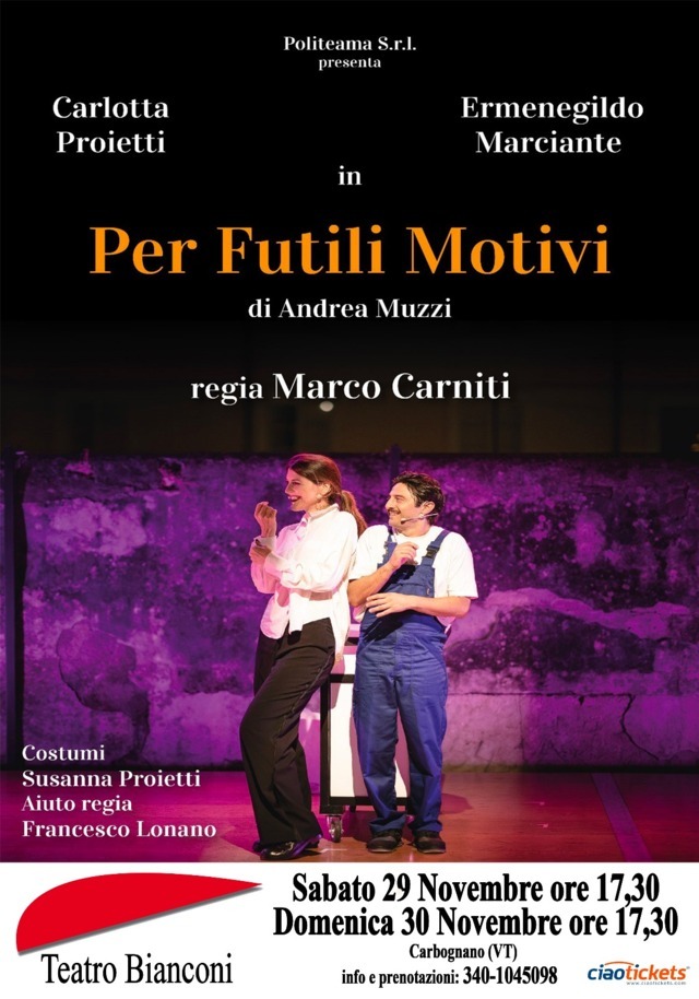 Carbognano, 23 novembre 2025: Il Teatro Bianconi di Carbognano si appresta a ospitare un appuntamento teatrale di particolare richiamo emotivo: Per futili motivi, in programma per due serate, sabato 29 novembre 2025 e domenica 30 novembre 2025, con inizio sempre alle ore 17.30.