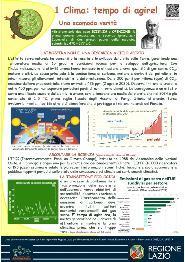 Sono alcune delle domande a cui cerca di dare risposta la mostra didattica “Clima: tempo di agire!”, realizzata dal Parco Regionale Marturanum ed esposta dal 26 febbraio al 14 marzo 2026 presso il Museo Spazio SMA dell’Università della Tuscia di Viterbo, nel complesso di Santa Maria in Gradi.