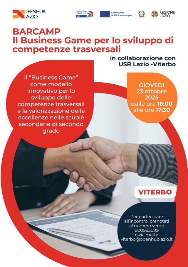 OpenHub Lazio, in collaborazione con l’Ufficio Scolastico Regionale per il Lazio – Ambito Territoriale di Viterbo, organizza, giovedì 23 Ottobre alle ore 16:00 presso la sala conferenze di OpenHub Lazio – sede di Viterbo, un incontro di approfondimento dedicato al format “Business Game” come modello innovativo per lo sviluppo delle competenze trasversali e la valorizzazione delle eccellenze nelle scuole secondarie di secondo grado.