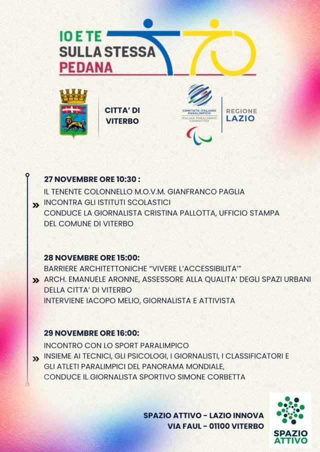 Dal 27 al 29 novembre torna Io e Te sulla stessa pedana. Appuntamento allo spazio attivo Lazio Innova (Valla Faul) con la manifestazione organizzata dal Comitato italiano paralimpico Lazio con il supporto del Comune di Viterbo – Assessorato Sport e Benessere. Tre giorni di eventi, incontri, approfondimenti insieme a protagonisti dello sport, atleti paralimpici del panorama mondiale, giornalisti, tecnici, psicologi, classificatori.