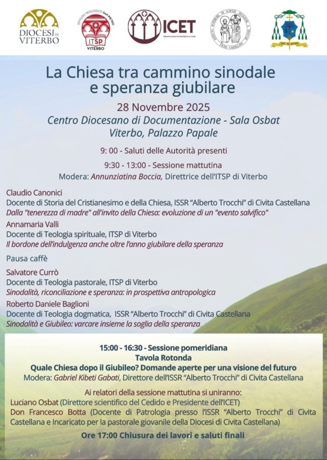 Un appuntamento interessante quello del 28 Novembre per gli amanti del “Cammino sinodale e speranza giubilare della Chiesa” in una Conferenza nella Sala Osbat presso il Centro Diocesano di Documentazione di Viterbo, finalizzato alla storia e alla cultura religiosa.