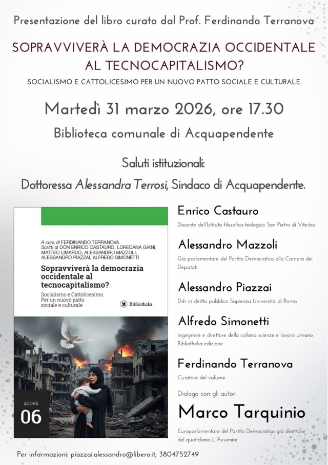 Marco Tarquinio, eurodeputato fortemente impegnato per la pace, giornalista e già direttore del quotidiano Avvenire, sarà ospite ad Acquapendente martedì 31 marzo 2026 alle ore 17:30 presso la Biblioteca comunale (Via Cantorrivo 13) per la presentazione del libro “Sopravviverà la democrazia occidentale al tecnocapitalismo? Socialismo e cattolicesimo per un nuovo patto sociale e culturale” a cura del professor Ferdinando Terranova.