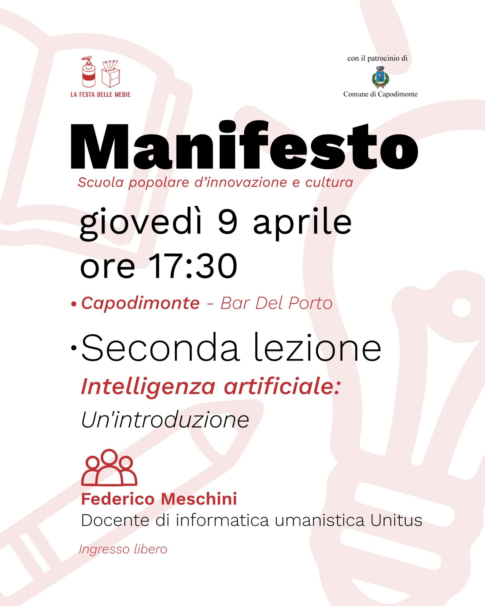 Prosegue a Capodimonte il percorso di “Manifesto – Scuola popolare d’innovazione e cultura”, iniziativa promossa dall’associazione La Festa delle Medie con il patrocinio del Comune di Capodimonte. Il prossimo appuntamento è in programma giovedì 9 aprile alle 17.30 al Bar Del Porto di Capodimonte.