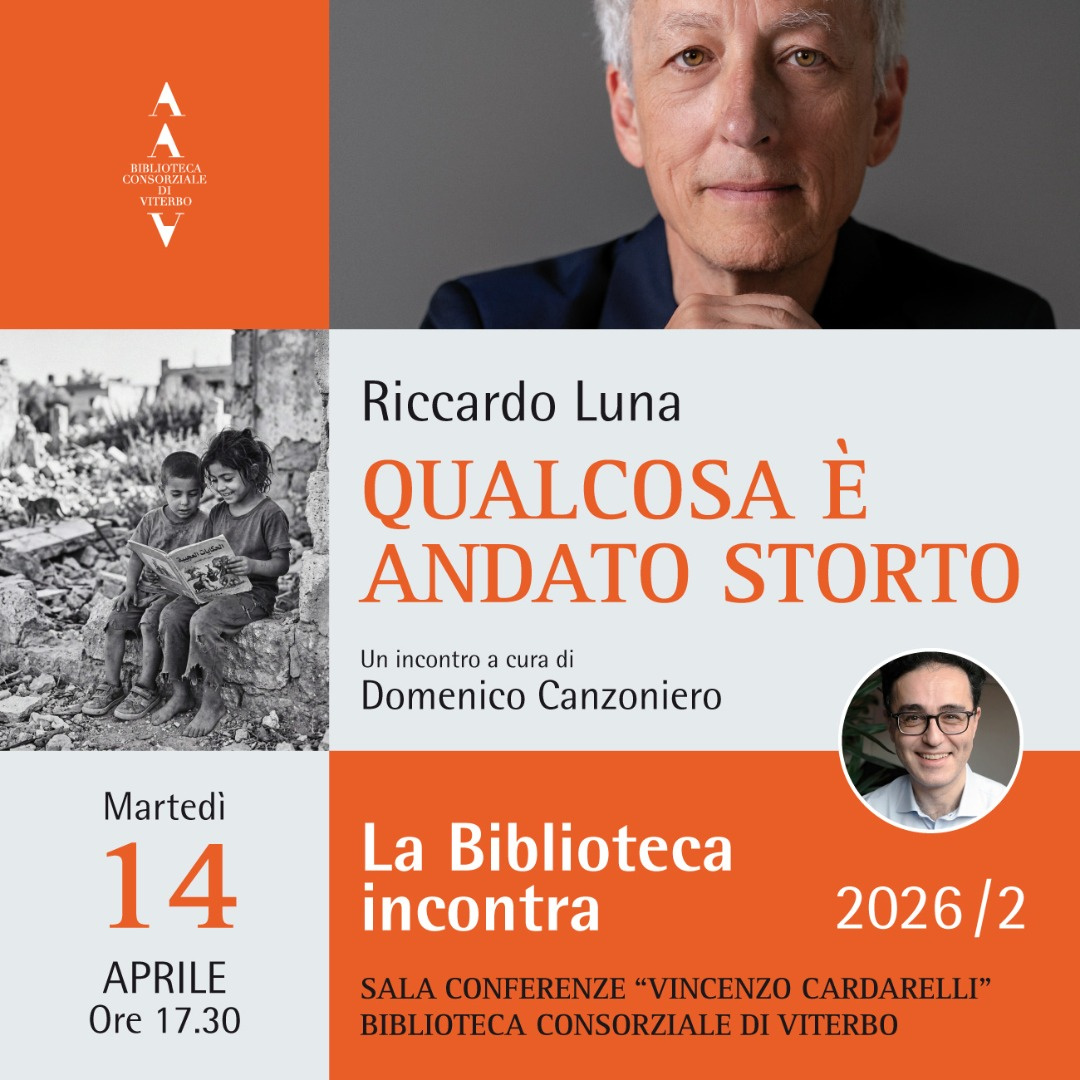 Martedì 14 aprile, alle 17.30, per il secondo appuntamento della rassegna “La Biblioteca incontra” – stagione 2/2026, sarà a Viterbo Riccardo Luna per presentare il libro Qualcosa è andato storto (Solferino) in dialogo con Domenico Canzoniero.