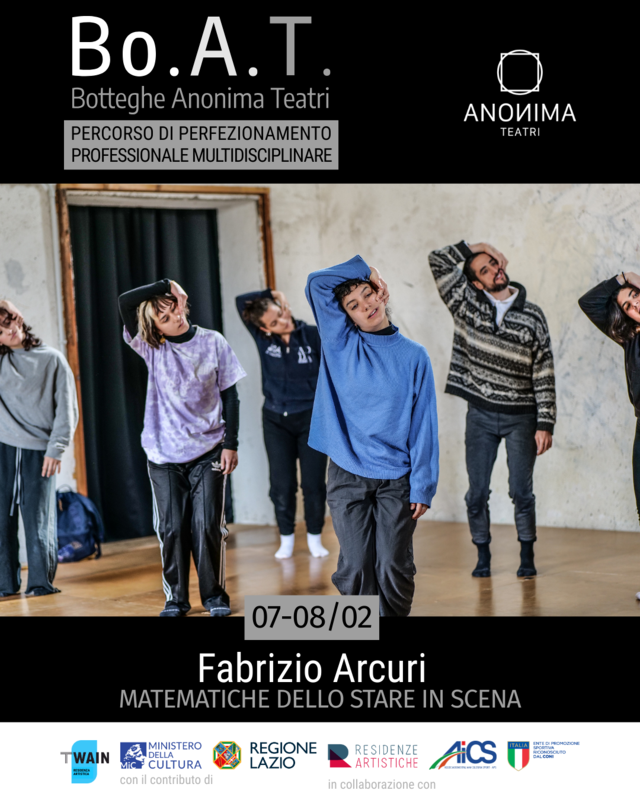 Sabato 7 e domenica 8 febbraio al Supercinema di Tuscania (VT) Fabrizio Arcuri conduce la masterclass “Matematiche dello stare in scena” all’interno di Bo.A.T – Botteghe Anonima Teatri, percorso di perfezionamento professionale multidisciplinare dedicato ad attori e danzatori tra i 20 e i 35 anni a cura di Anonima Teatri, organizzato da Twain nell’ambito del progetto Residenza Artistica sostenuto dal Ministero della Cultura e dalla Regione Lazio.