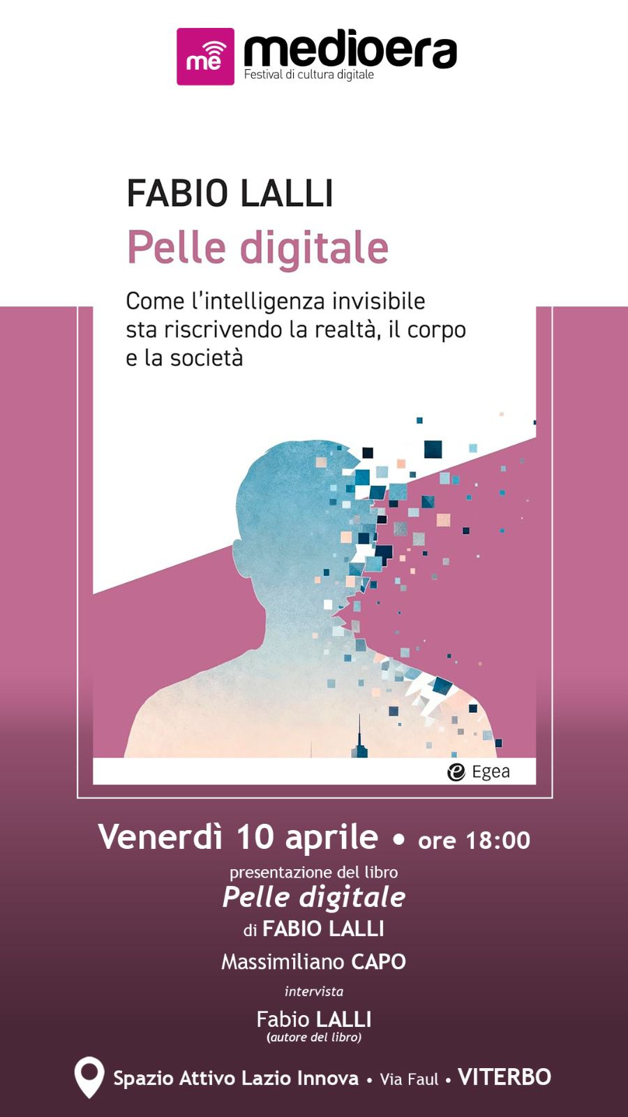 Nuovo appuntamento a Viterbo con Medioera, il festival di cultura digitale, che venerdì 10 aprile alle 18 ospiterà la presentazione del libro “Pelle digitale” di Fabio Lalli, pubblicato da Egea. L’incontro, con ingresso gratuito, si terrà allo Spazio Attivo Lazio Innova, in via Faul, e sarà un’occasione di confronto su uno dei temi più centrali del nostro tempo: il rapporto tra intelligenza artificiale, corpo, realtà e trasformazioni sociali.