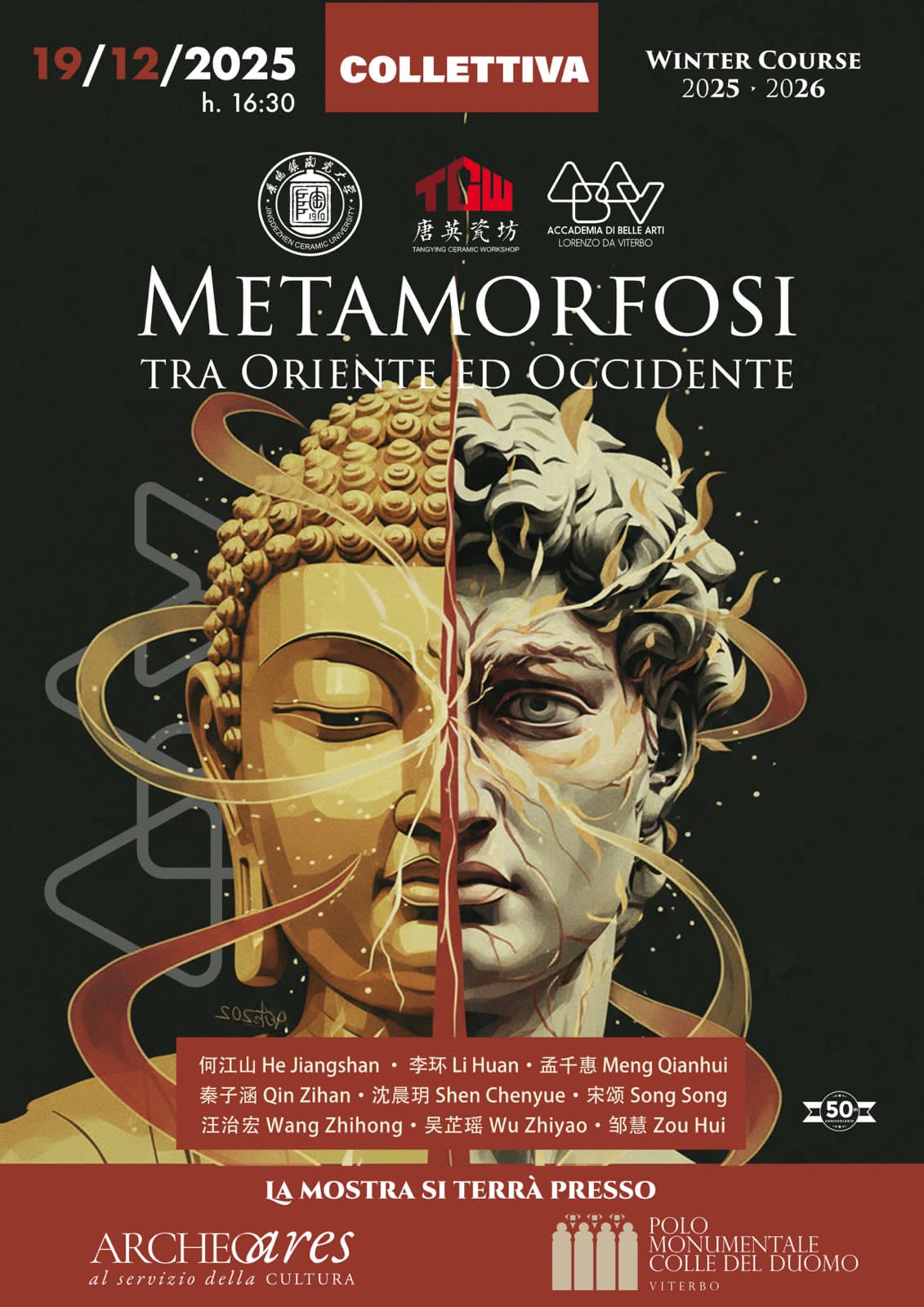 Venerdì 19 dicembre, alle ore 16:30, il Polo monumentale Colle del Duomo di Viterbo ospita la mostra collettiva “Metamorfosi. Tra Oriente ed Occidente” grazie alla collaborazione tra Archeoares e l’Accademia delle Belle Arti Lorenzo Da Viterbo.