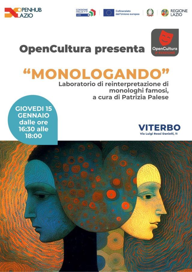 Giovedì 15 Gennaio alle ore 16.30 presso l’OpenHub Lazio di Viterbo sito in via Luigi Rossi Danielli 11, inizierà il laboratorio “Monologando”, una reinterpretazione di monologhi famosi a cura di Patrizia Palese.