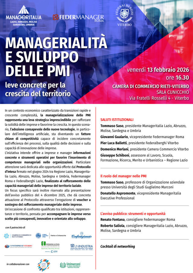 L’iniziativa, promossa da Manageritalia Lazio, Abruzzo, Molise, Sardegna e Umbria, in sinergia con Federmanager Roma e Federalberghi Viterbo, vanta un ampio sostegno istituzionale. Oltre al patrocinio della Camera di Commercio Rieti-Viterbo, l’evento vede la partecipazione di Confartigianato Viterbo, Federlazio, CNA Viterbo-Civitavecchia, Confimprese Viterbo e Unindustria Viterbo, con la collaborazione tecnica di Cowo 849 e Unimarconi.