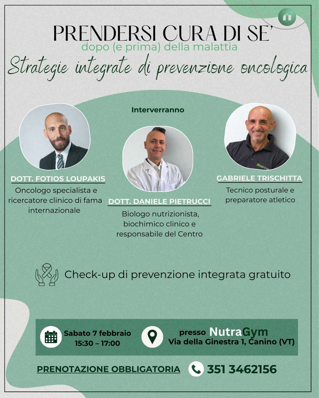 Sabato 7 febbraio, dalle 15:30 alle 17:00, presso il centro wellness Nutragym in Via della Ginestra 1, Canino (VT), si terrà l’incontro pubblico dal titolo “Prendersi cura di sé (dopo e prima) della malattia – Strategie integrate di prevenzione oncologica”, un evento dedicato alla salute e alla prevenzione, aperto alla cittadinanza.